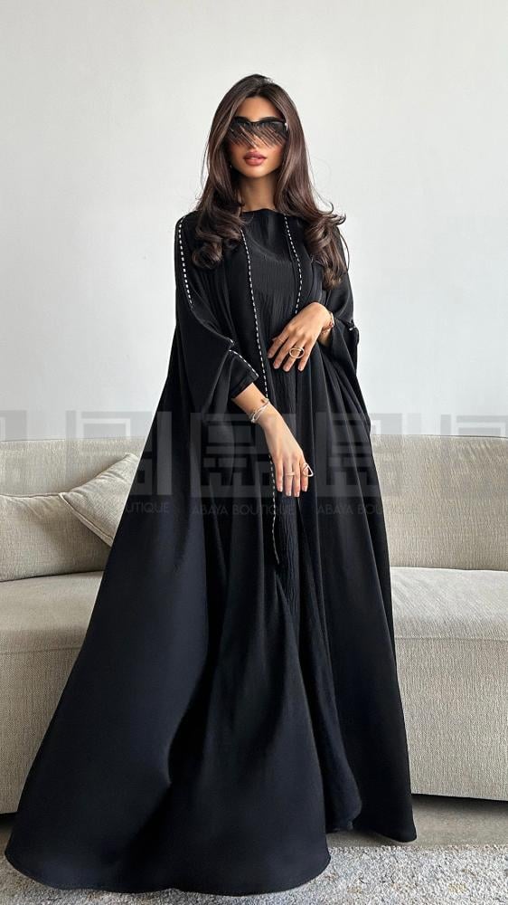 بتفصيل بشت أنيق ينسدل بخفة، مزينة بكريستالات تضيف بريق ناعم ولمسة فخامة،