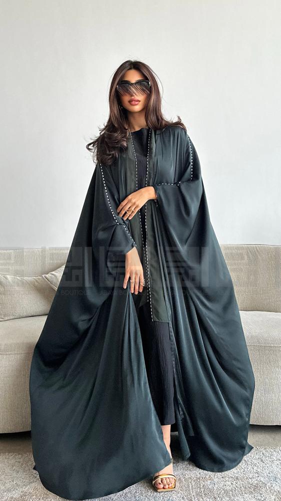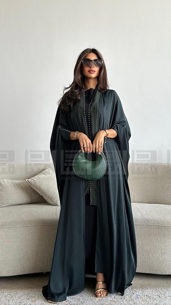 - العباية الأولى: عباية بشت حرير باللون الزيتي، بتصميم واسع وفخم مزين بلمسات الكريستال البراقة التي تضيف لها رونقًا خاصًا ولمعانًا راقيًا، لتكون خيارك الأمثل في المناسبات المميزة واللقاءات الأنيقة.