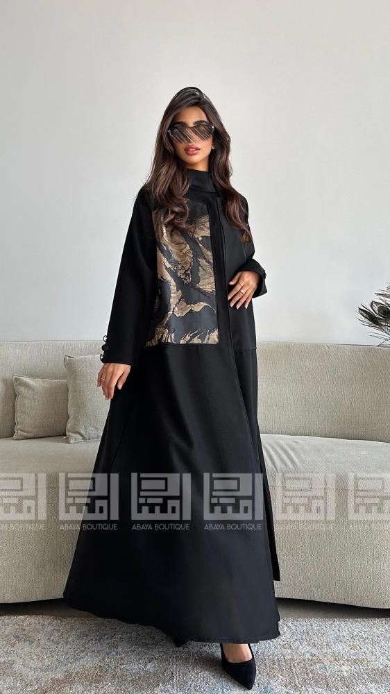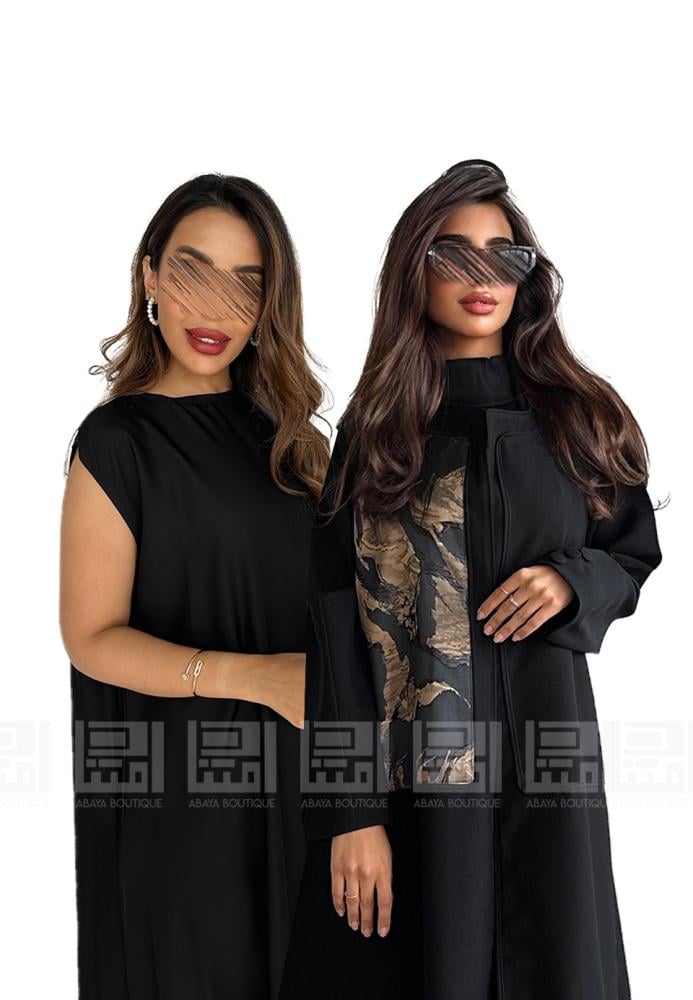 عباية سوداء كلوش بقماش ليمار البارد تزدان العباية بتداخل قماش الجاكار المنقوش باللون البني وبقيطان سوداء بارزة باكمام العباية
