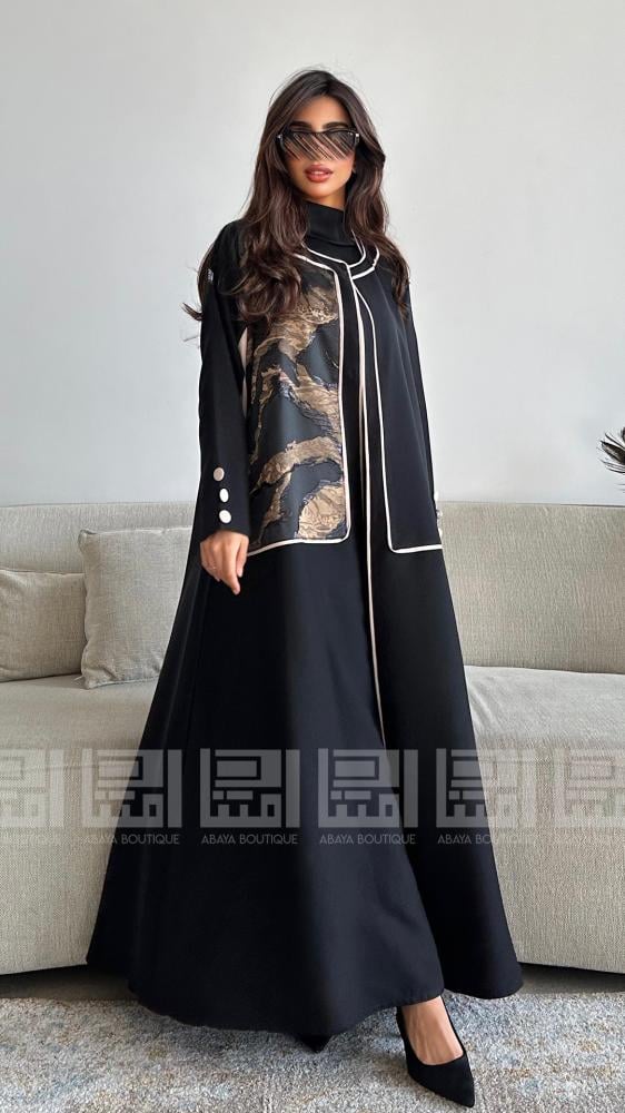 عباية سوداء كلوش بقماش ليمار البارد تزدان العباية بتداخل قماش الجاكار المنقوش باللون البني وبتداخل اللون البيج باكمام العباية . تنتهي الاكمام بأزرار زينة مبطنة باللون البيج كما تزدان اطراف العباية باللون البيج