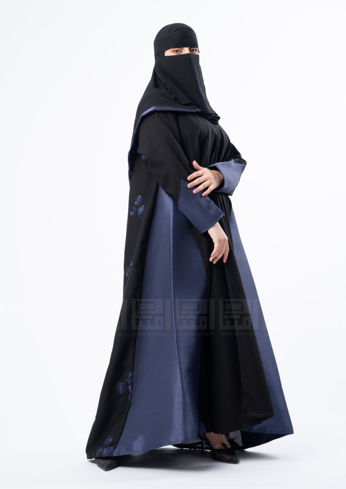 تألقي بعبايّة سوداء بتطريز أزهارٍ متنوعة في كامل العبايّة تجعلها زاهيّة ، وبأكمامٍ مفتوحة مبطنة باللون الأزرق، وبقصةٍ مميزة في جوانب العباية تستمر للأطراف حِيك بقماش (ميكيادو) الأزرق الباهر.