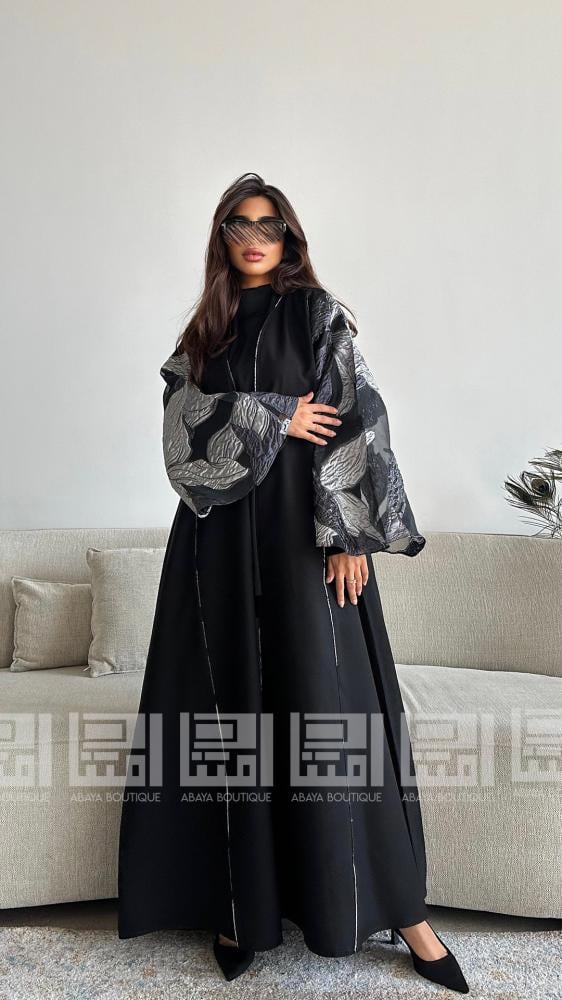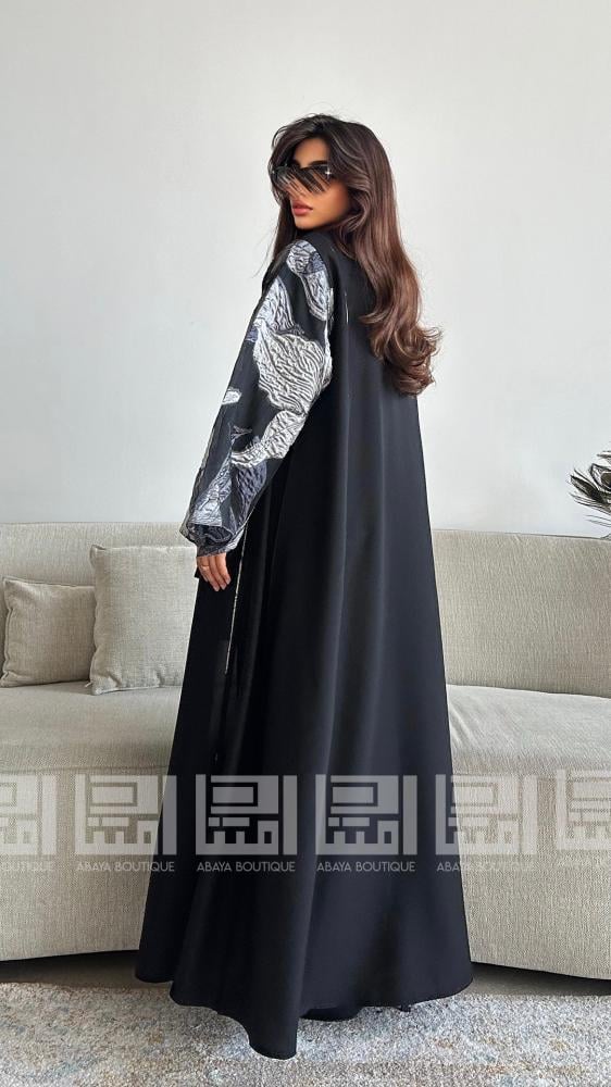 عباية سوداء كلوش بقماش رغدة البارد تزدان باكمام من الجاكار المنقوش باللون الرمادي والكحلي ، تغلق العباية لف ، قيطان طولية بارزة كإضافة مميزة تضفي لمسة مختلفة للعباية