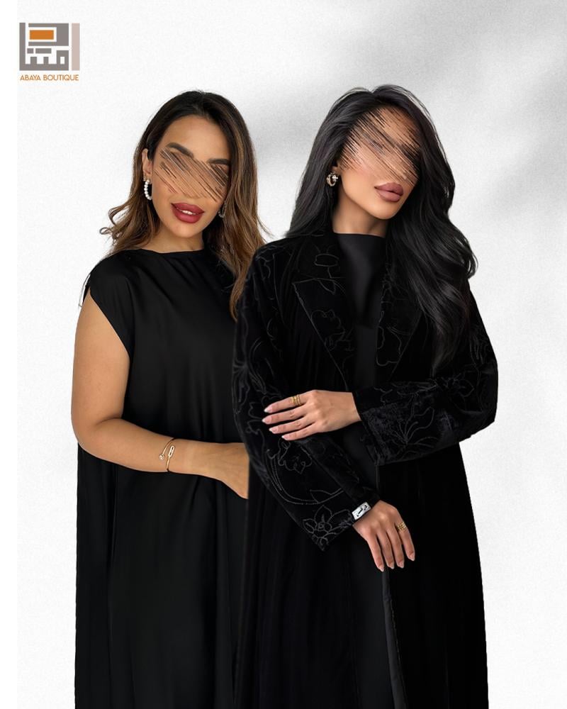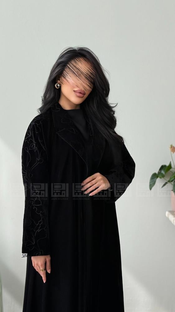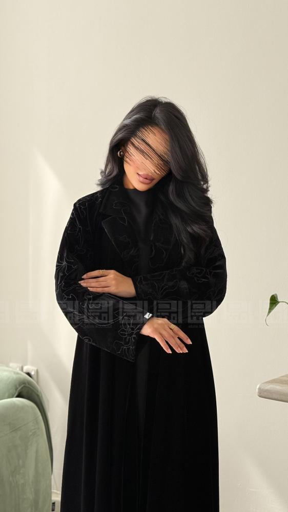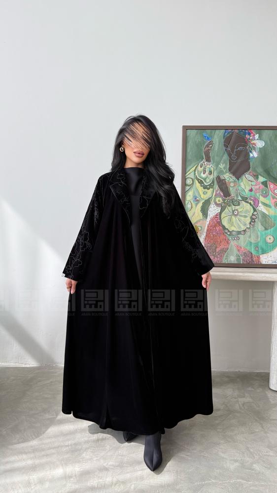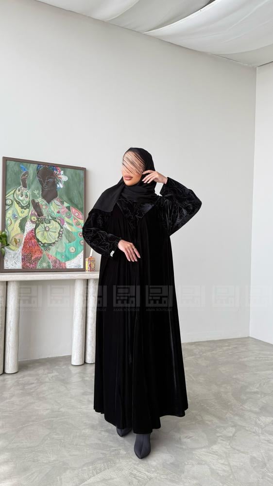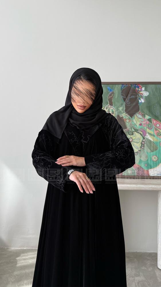 عباية سوداء دبل كلوش من قماش المخمل، تزدان بتطريز ناعم في الياقة والأكمام، وتأتي مع طرحة سوداء بطرف مخمل أنيق.
