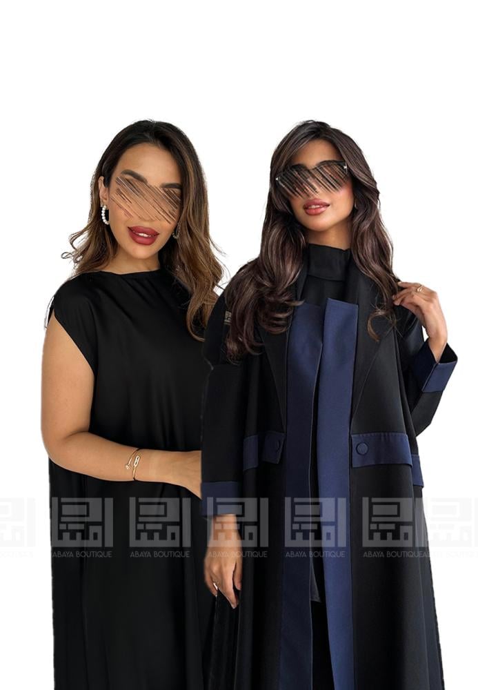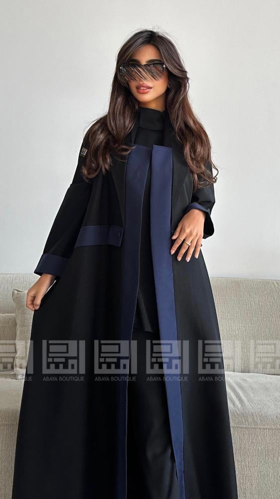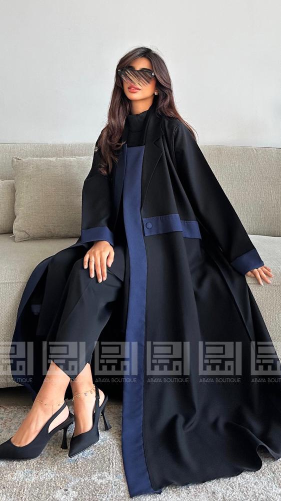 عباية سوداء نصف كلوش بقماش ليمار البارد تزدان العباية بتداخل اللون الكحلي باكمام العباية والمرد وتزدان بحزام لوني بمنتصف العباية . كما تزدان العباية بياقة الجاكيت ومرد داخلي باللون الكحلي