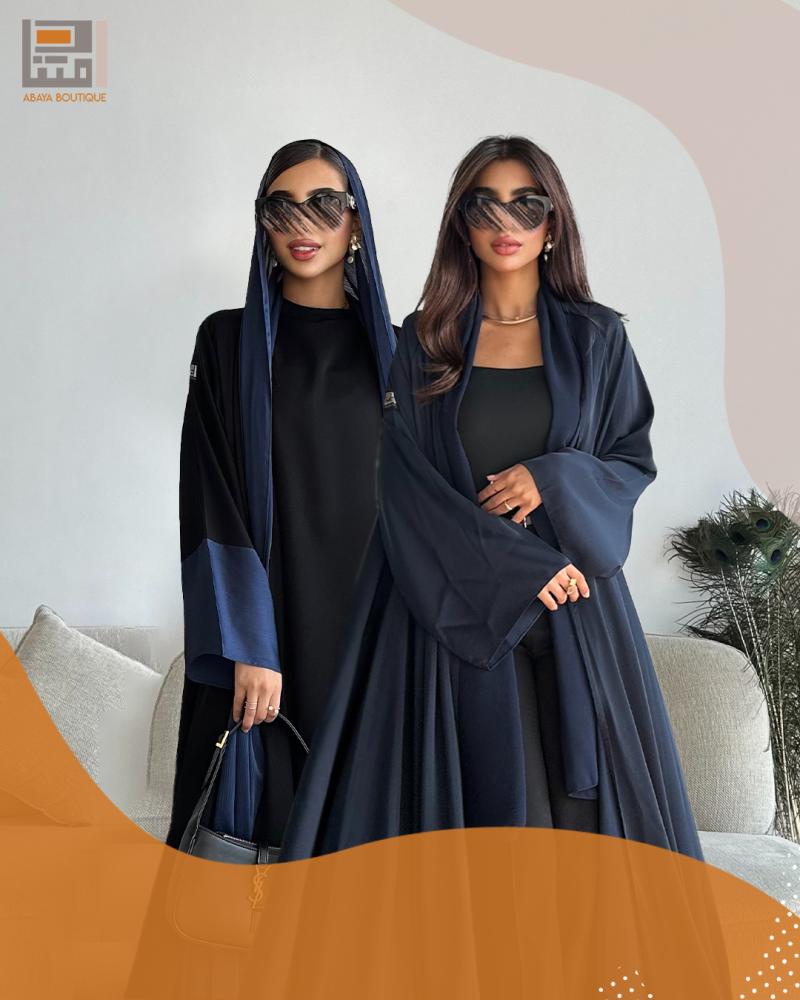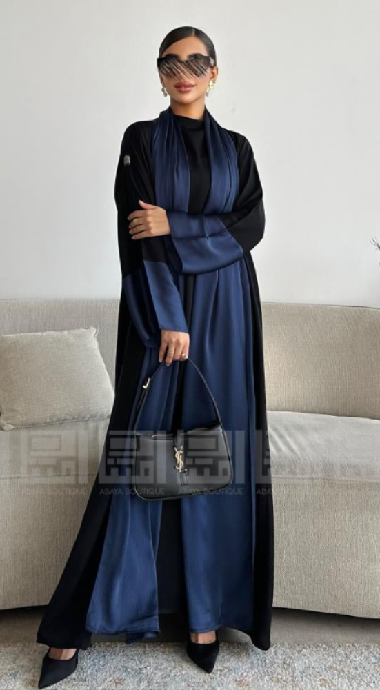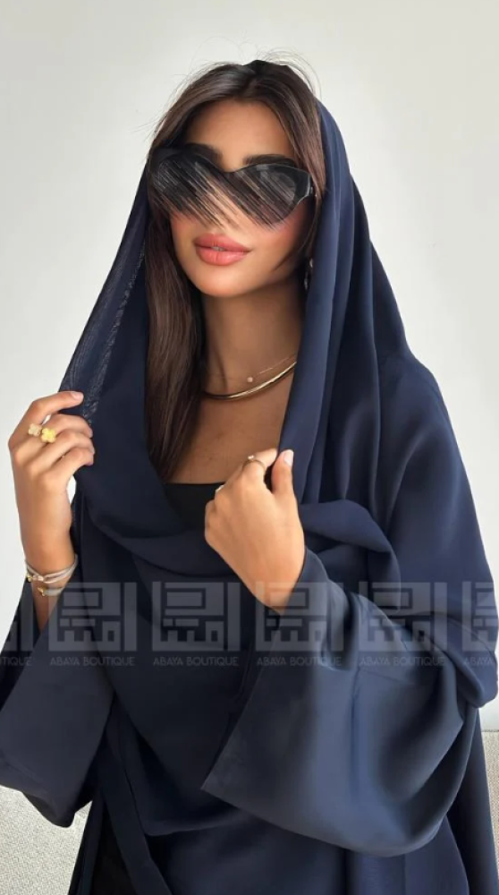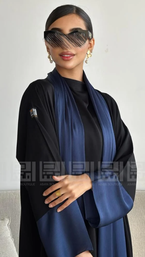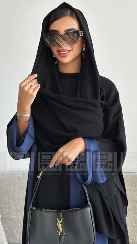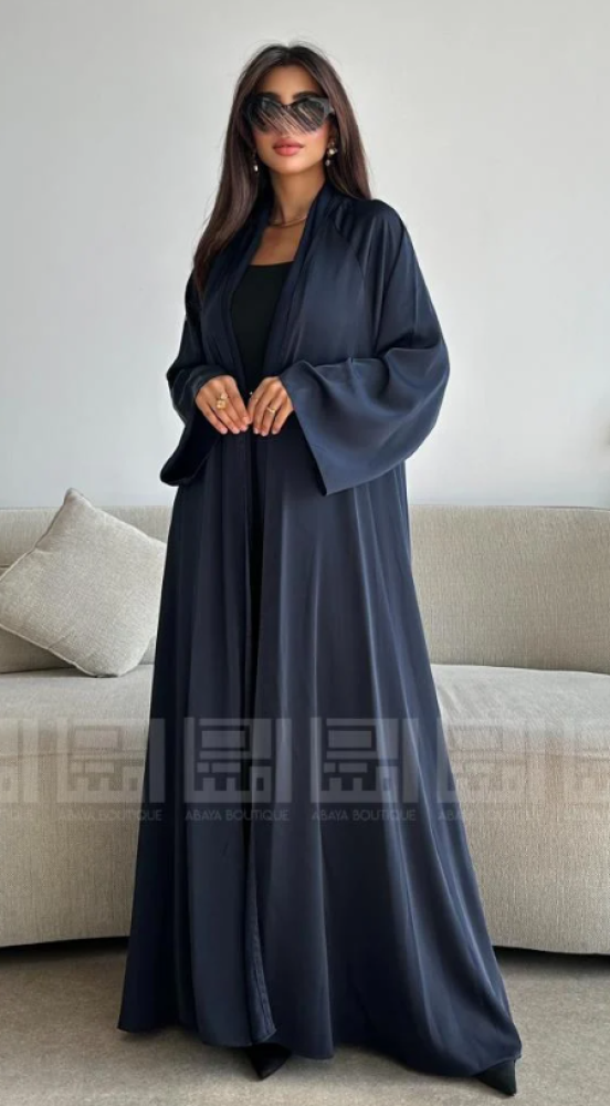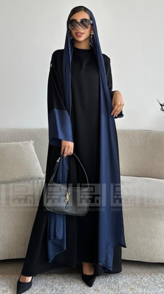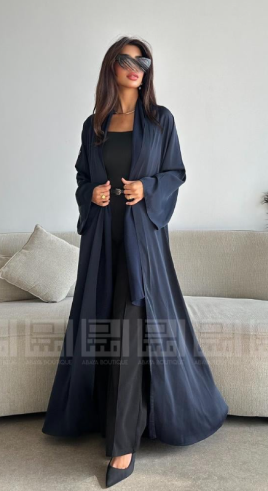- العباية الأولى: مصنوعة من قماش بلاك بيري باللون الأزرق الداكن، تتميز بملمس ناعم ومريح، مما يجعلها مثالية للإطلالات اليومية. كما أن لمعة القماش تضفي لمسة جمالية. تصميمها العملي يضمن لكِ إطلالة انسيابية تناسب مشاويرك اليومية وتضفي لمسة من الذوق الرفيع.