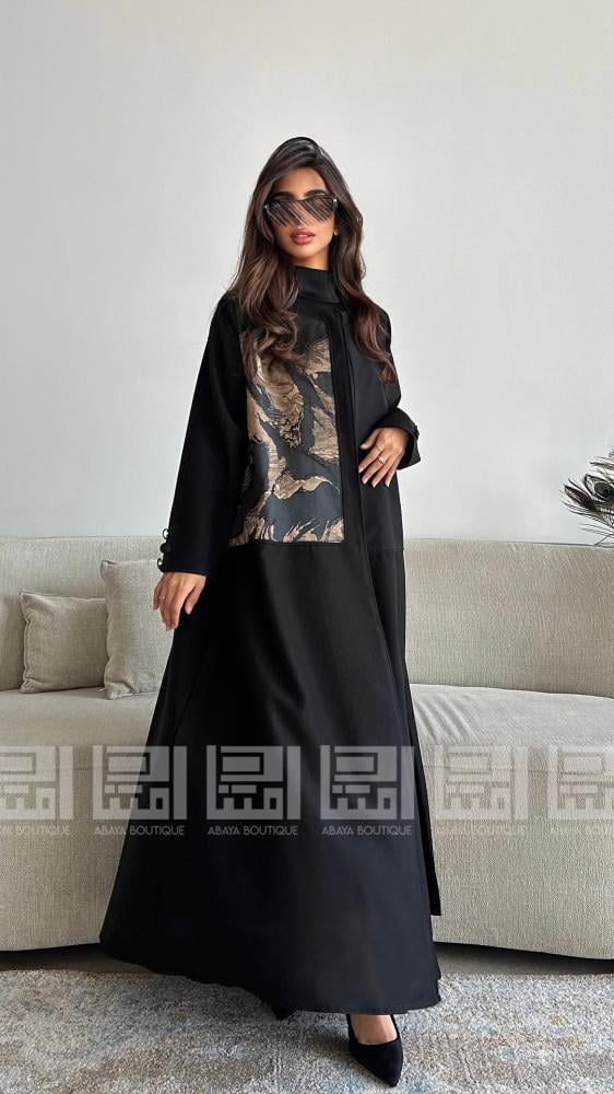 تتميز العباية بلونها الأسود العميق الذي يضفي لمسة من الرقي، بينما يتداخل معها قماش الجاكار المنقوش باللون البني، مما يخلق تباينًا جذابًا. تم تصنيعها من قماش ليمار الفاخر، الذي يتميز بملمسه الناعم وخفة وزنه، مما يجعلها مريحة طوال اليوم. كما أن العباية مصممة بقصة ربع كلوش، مما يمنحك حرية الحركة وأناقة لا مثيل لها.
