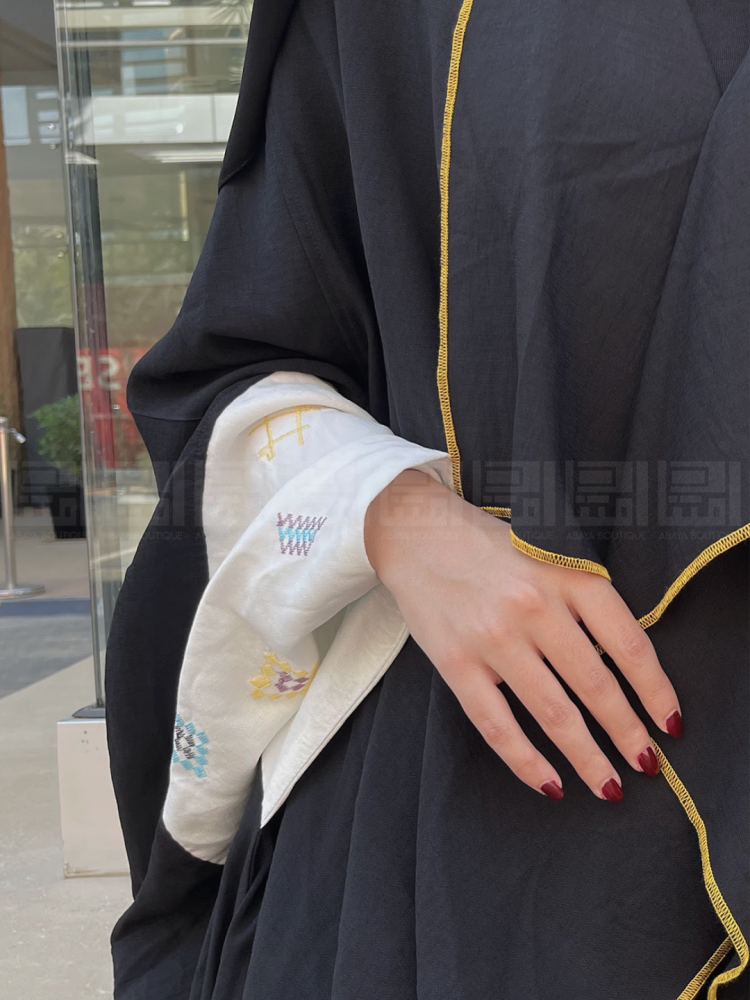 - عباية قطرية بقصة البشت مزينة بقيطان سدو أصفر كركمي مزينة بأكمام بيج بقصة مميزة وبنقش سدو ملونة لإطلالة حيوية