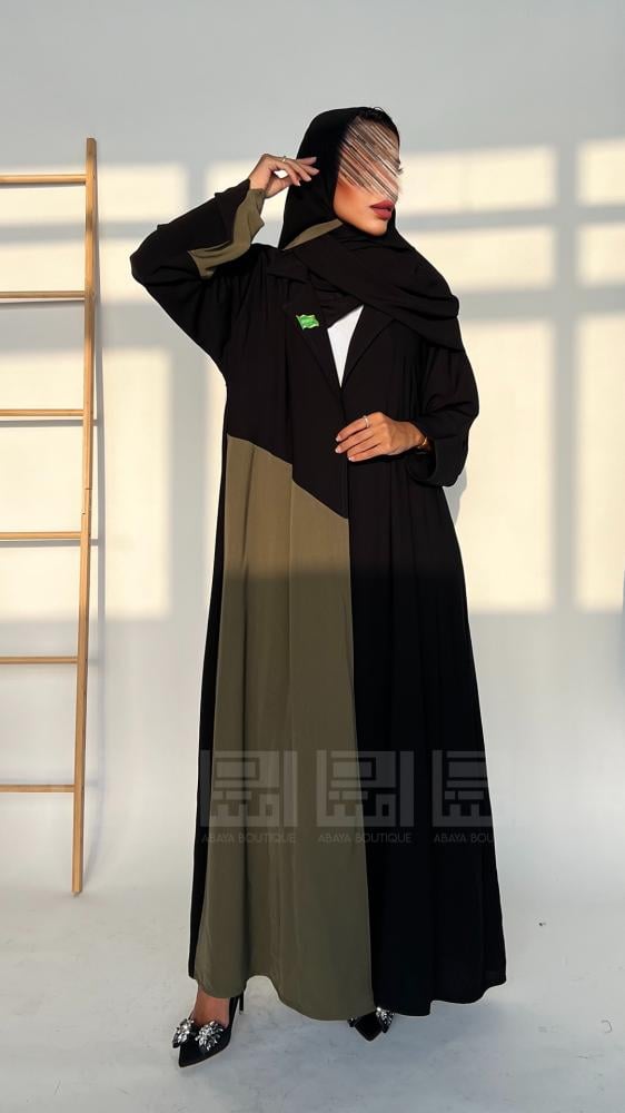 تتميز العباية بقصتها المستقيمة وانسيابية قماشها مع تداخل اللون الزيتي حيث تمنحك إطلالة ترندية راقية