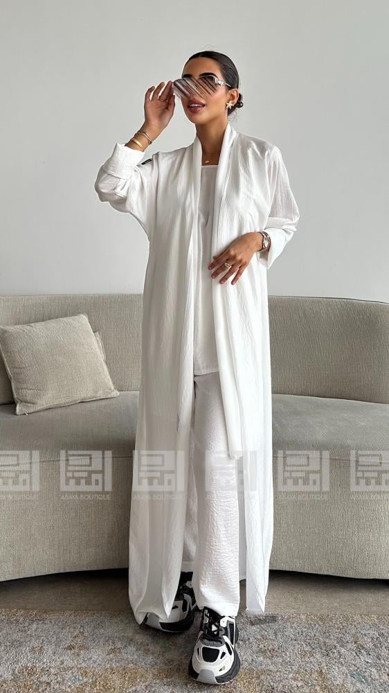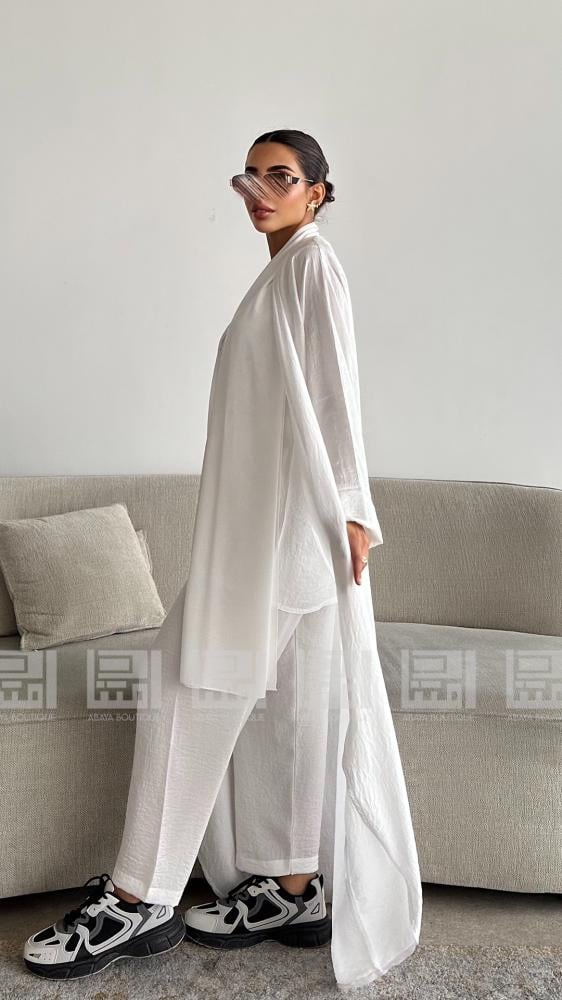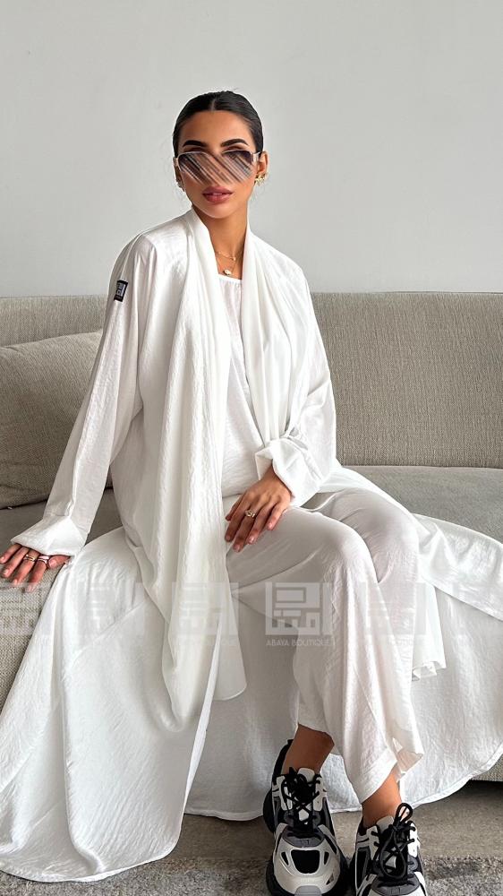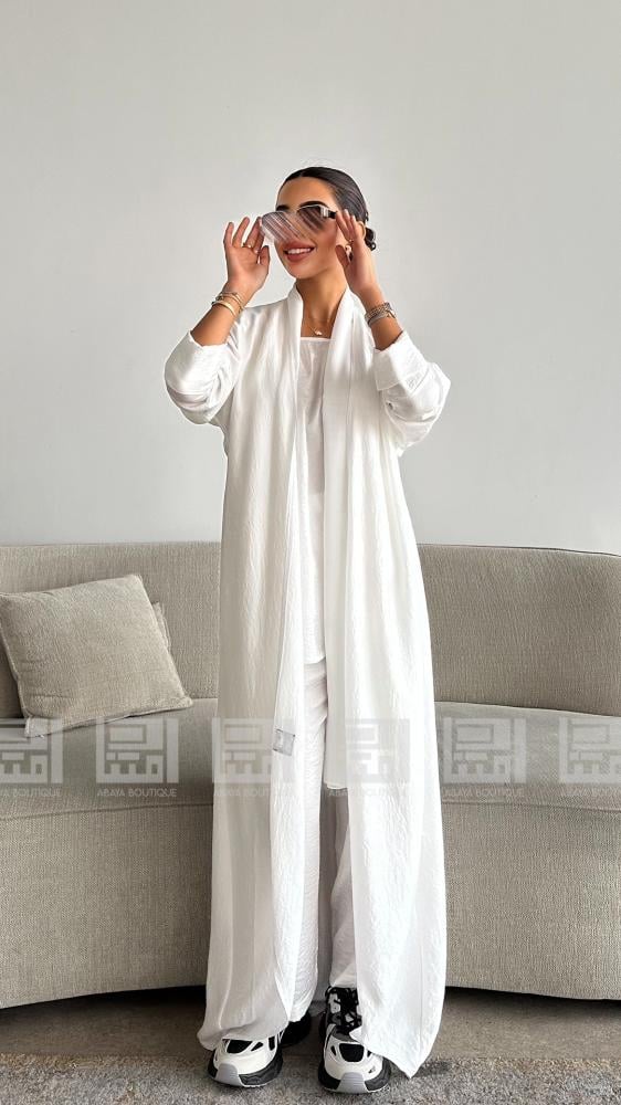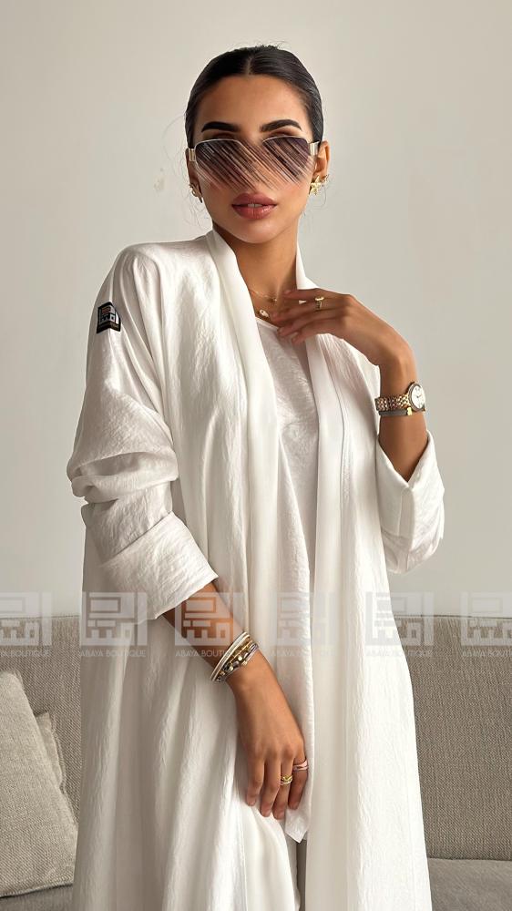 عباية بيضاء صيفية مع بدلة داخلية أنيقة هي الخيار المثالي لإطلالة عصرية ومريحة في الأوقات الحارة. مصنوعة من حرير مغسول، توفر لك هذه العباية لمسة من الفخامة والراحة في آن واحد. تبرز العباية بلونها الأبيض الفاخر الذي يمنحك مظهراً أنيقاً وجذاباً، مما يجعلها من القطع الأساسية في خزانة ملابسك.