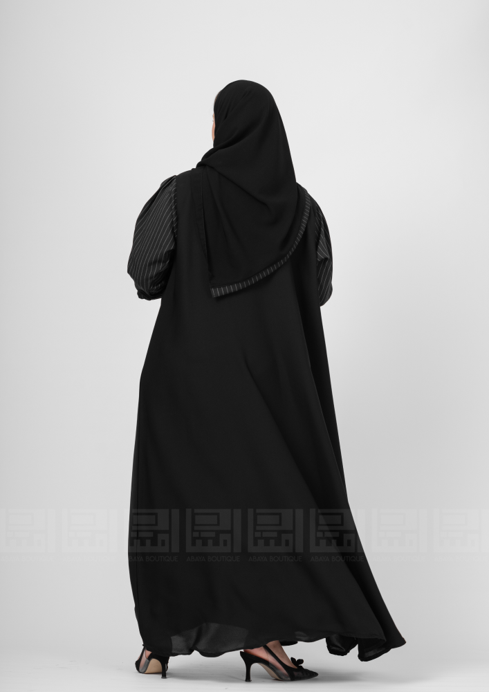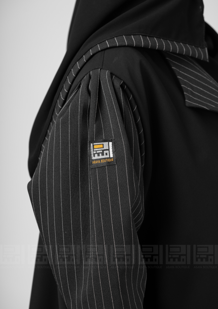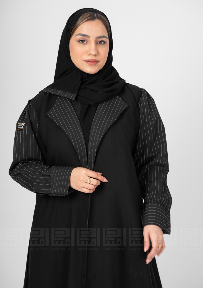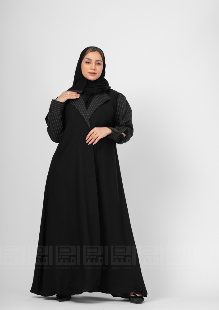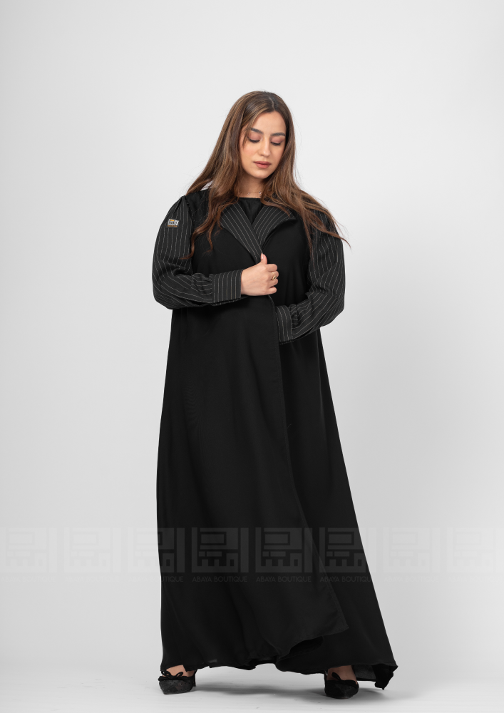 تألقي بعباية رسمية أنيقة بقماش مخطط، التي تجمع بين الفخامة والراحة، مما يجعلها الخيار المثالي للنساء العاملات. تتميز هذه العباية بلون أسود حالك، مع تمازج دقيق للنسيج المخطط في الياقة، مما يضفي لمسة من الأناقة والتميز. الأكمام مصممة بأزرار في النهاية، مما يمنح العباية مظهرًا فخمًا وأكثر عملية.