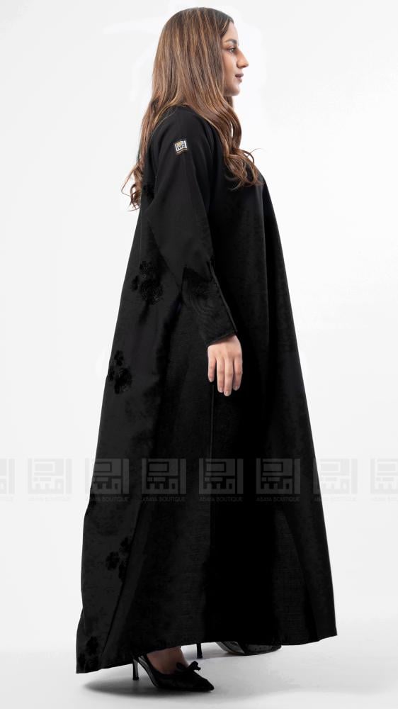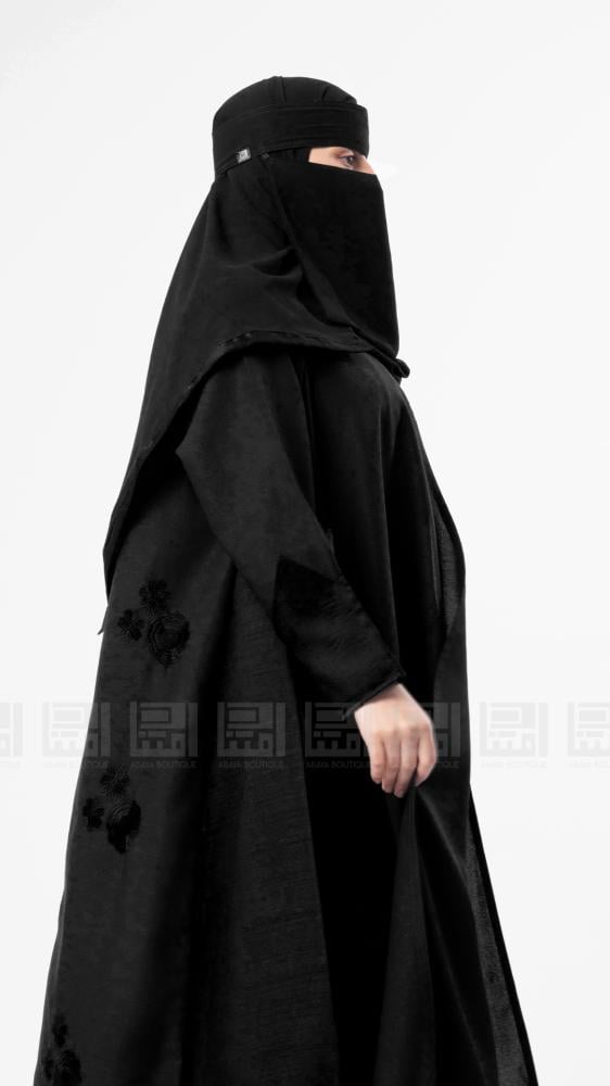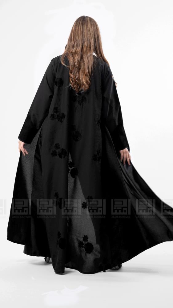 تألقي بعبايّة سوداء بتطريز أزهارٍ متنوعة في كامل العبايّة تجعلها زاهيّة، وبأكمامٍ مفتوحة مبطنة باللون الأسود، وبقصةٍ مميزة في جوانب العباية تستمر للأطراف حِيك بقماش (ميكيادو) الأسود الباهر.