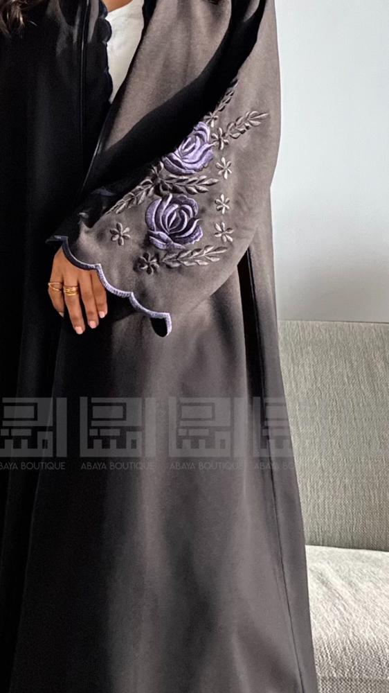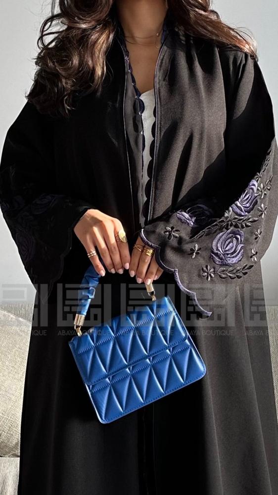 عباية سوداء باردة بأكمام انثوية رقيقة مليئة بتطريز الورد بالالوان الاكثر طلباً الأسود والكحلي بطرف مميز من تطريز والقصة مموجة بتطريز الكحلي بقصة ربع كلوش صممت بقماش رغدة