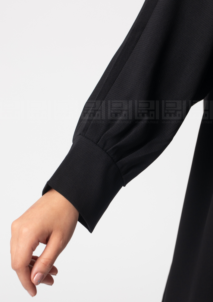 عباية باللون الأسود الملكي الفاحم بأكمام مزمومة من المعصم بقماش مقوى بقصة البف على المعصم