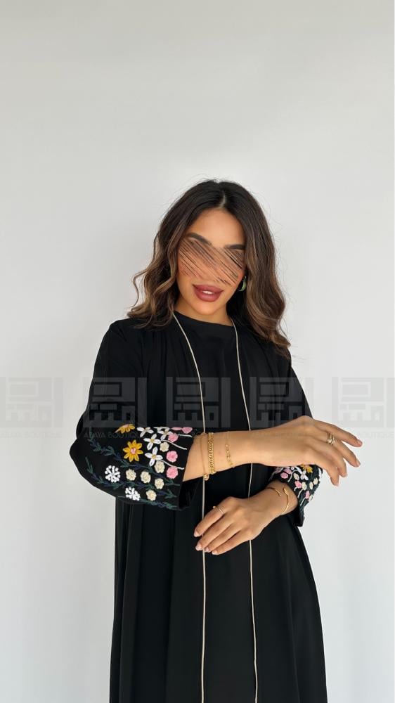 عباية كريب صيفية مطرزة بالورود بتفاصيل أنيقة تعكس جمال الطبيعة.