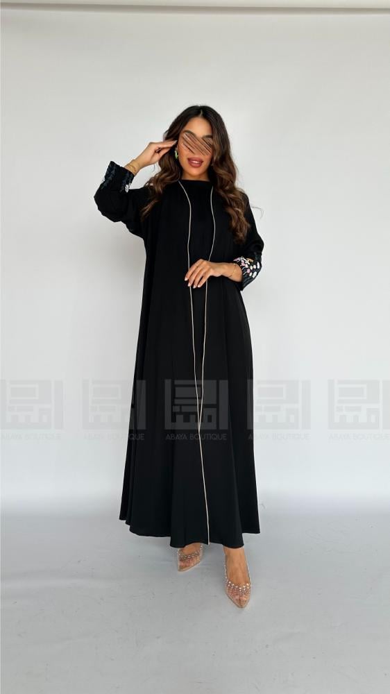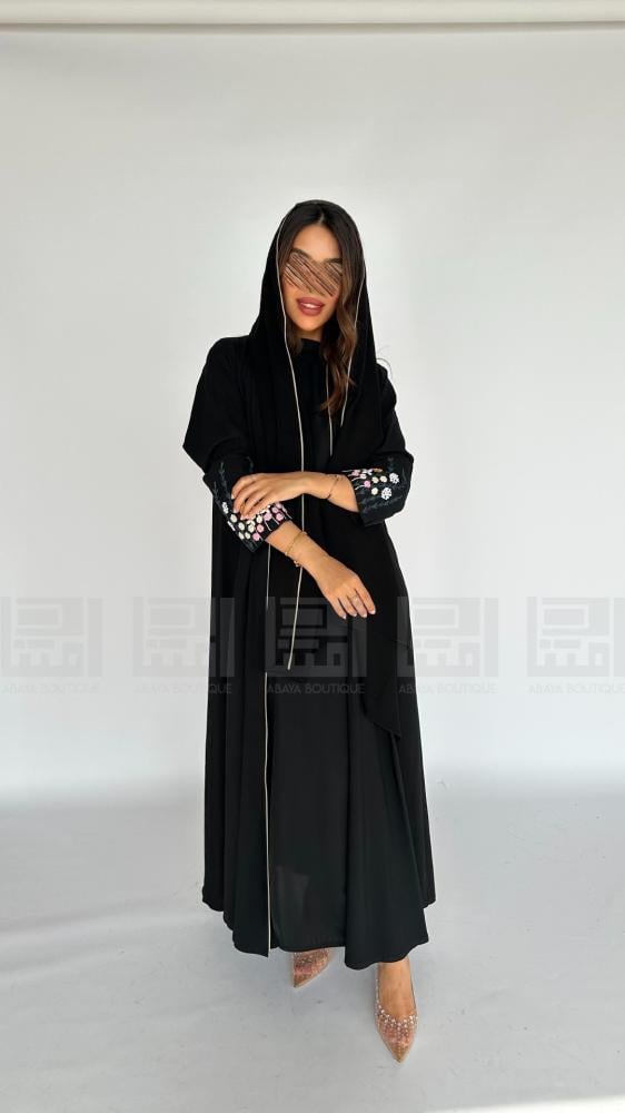 تأتي العباية بقصة ربع كلوش، مما يضفي عليها لمسة من الأناقة والحرية في الحركة. الأكمام مزينة بتطريزات ملونة من الورود التي تضيف لمسة من الحيوية والجمال، في حين أن القيطان البيج يضيف لمسة من الرقي.