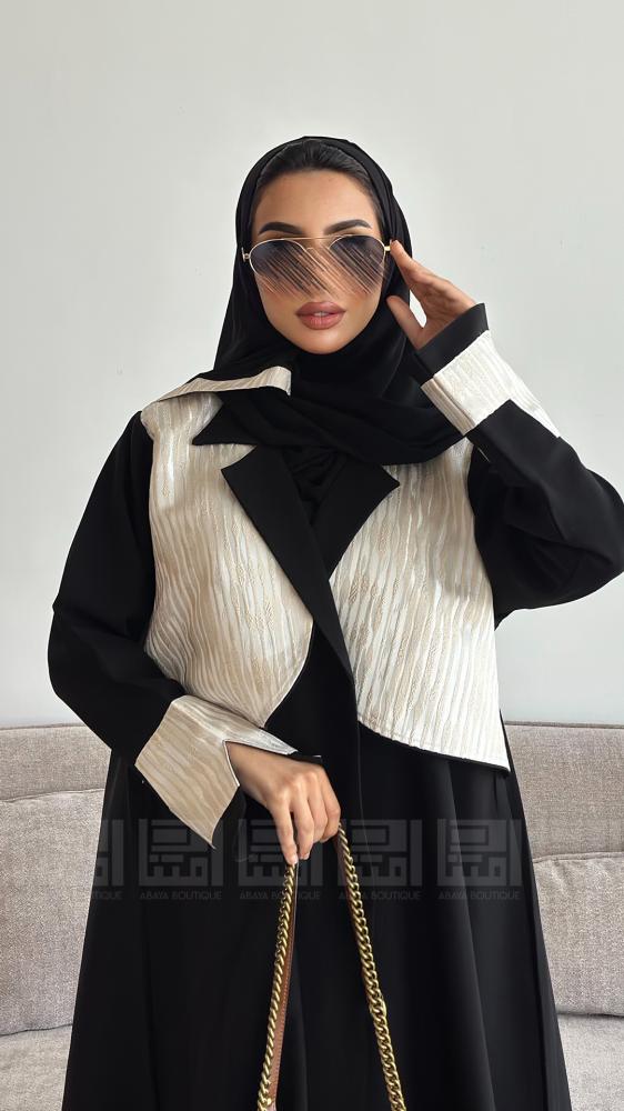 - تتزين العباية بتفاصيل فاخرة من قماش الجاكار باللون السكري المذهب، حيث تبرز الأناقة من خلال التداخلات الأنيقة التي تضيف عمقًا ورونقًا للمظهر.