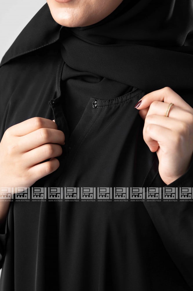 عباية باللون الأسود الملكي الفاحم، قصة العباية بقصة الكلوش القصة المفضلة لمنقبات والمحجبات تميزت العباية بتصميمها المغلق بالكامل . وياقتها الدائرية ولسهولة ارتداء العباية تم تزويدها بطقطق من الاعلى .