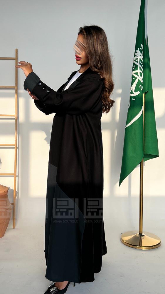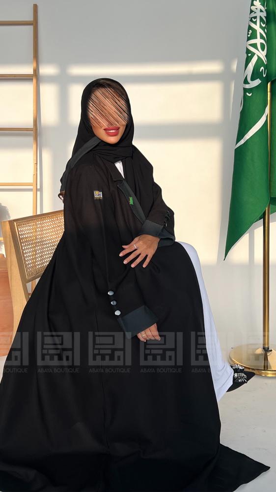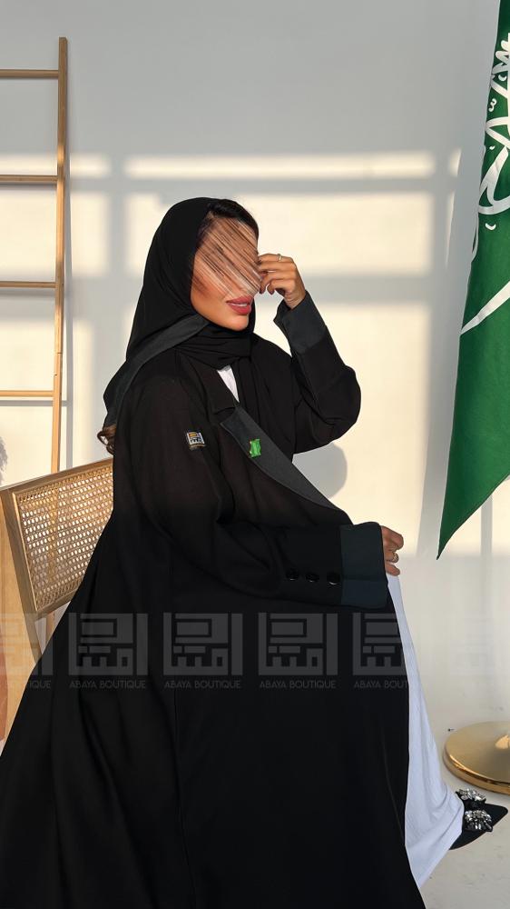 تتميز العباية بياقة بقصة الجاكيت باللون الأخضر، مما يخلق تناسقًا رائعًا بين الأسود والزيتي. هذا التصميم الفريد يجعلها مناسبة لمختلف المناسبات، سواء كانت يومية أو خاصة.