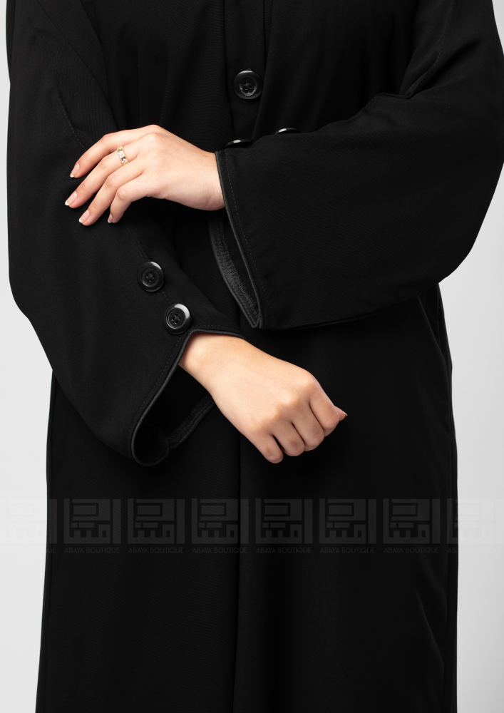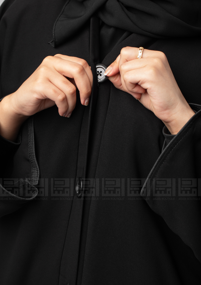 عباية يومية سوداء ، بقصة واسعة تزدان العباية بأزارير تجمل العباية بشكل طولي من ان قصة الأكمام واسعة وبقطان بارزه وتتميز بالأزارير السوداء
