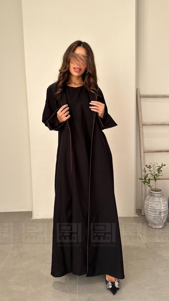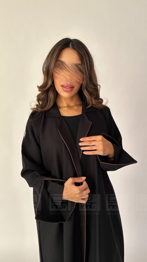 عباية سوداء يومية بفستان داخلي متصل ، كما صممت من أفضل انواع الأقمشة الراقية التي تمنحك راحة كبيرة عند الارتداء خصوصا في الأيام الحارة في الصيف، أنيقة بتصمميمها رسمي ياقة جاكيت تزدان بتفاصيل انيقة بقيطان بنية على اطراف العباية وقصة أكمام مميزة