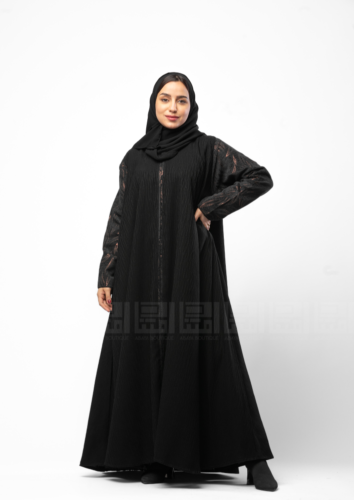 تمتاز عباية الكلوش السوداء بأكمامها ذات القَصَّة المستقيمة، حيث تم تصميم الأكمام بقماش بلون النحاس وتزين حوافها بالقيطان