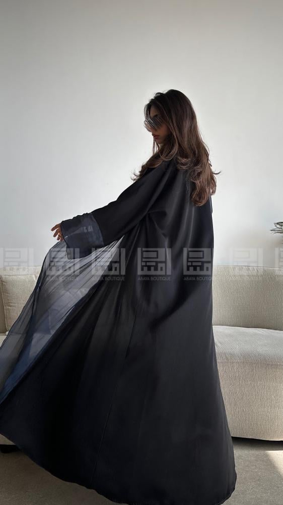 صُممت العباية بقصة A Line، مما يمنحها شكلًا أنيقًا مع انسيابية رائعة، حيث تبرز جمال الجسم دون أن تكون ضيقة. القماش المصنوع من بلاك بيري العريق، المعروف بخفته وعمليته، يضمن لك حرية الحركة والراحة. بالإضافة إلى ذلك، تم إضافة لمسة من الحرير الخفيف باللون الأزرق الداكن، مما يعزز من جاذبية التصميم ويجعله مثالياً للمناسبات اليومية.