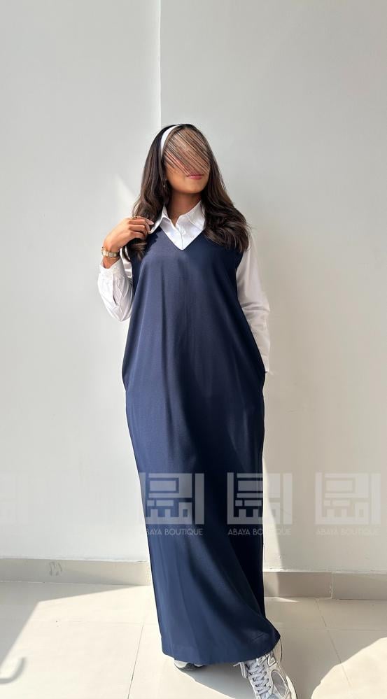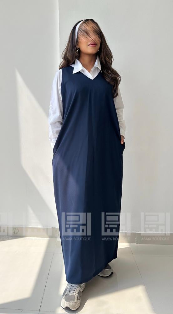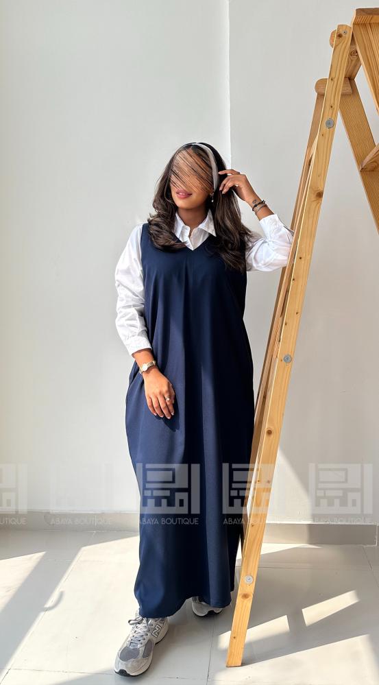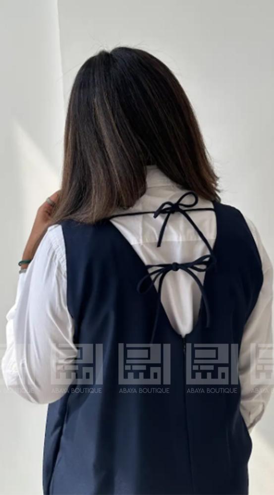 مريول شيال كحلي يتميز بقصة مثلثية من الامام و الخلف مع ربطتين من الخلف يمكن التحكم بها بكل مرونة
