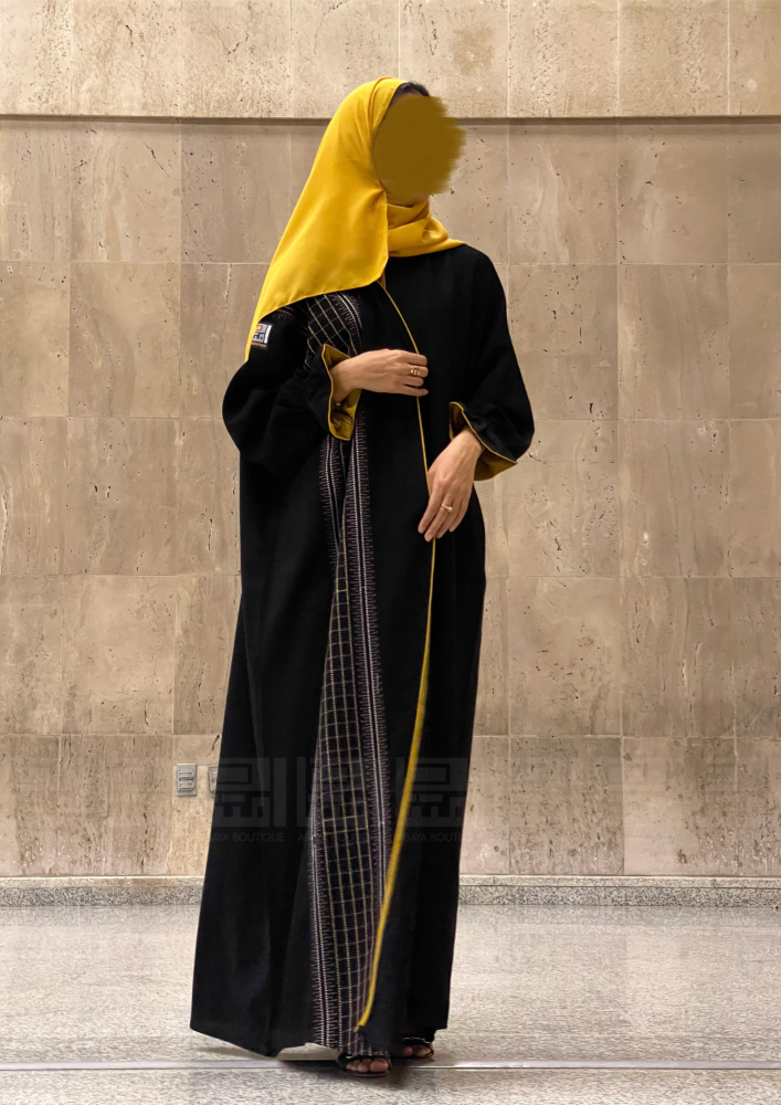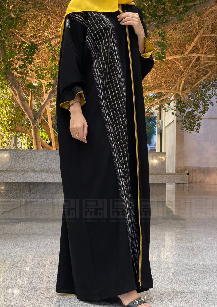 مزينة بالتطريز الهندسي الابيض من الجانب الأيمن، بقصة اكمام الحرس المبطنة بالأصفر.